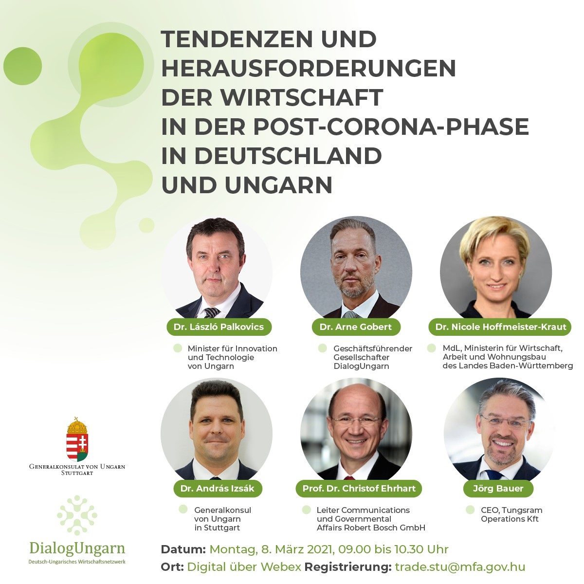 A DialogUngarn – Német-Magyar Gazdasági Hálózat, valamint Magyarország Stuttgarti Főkonzulátusa szeretettel meghívja Önöket Nicole Hoffmeister-Kraut, baden-württembergi gazdasági, munkaügyi és lakásügyi miniszter (felkérés alatt), valamint Dr. Palkovics László, innovációs és technológiai miniszter részvételével megrendezésre kerülő pódiumbeszélgetésére. Bővebben: ►itt