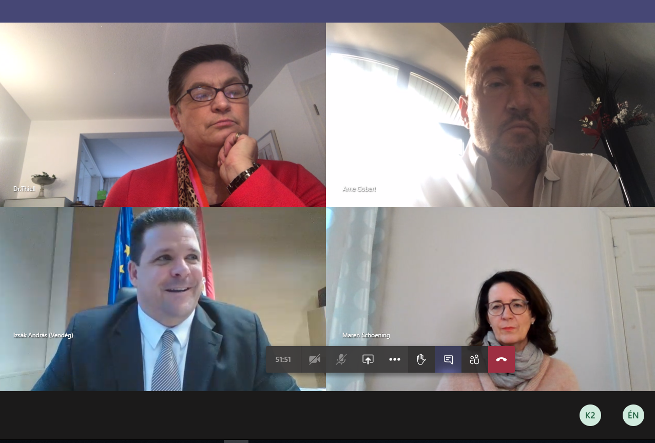 Magyarország Stuttgarti Főkonzulátusa képviseletében Dr. Izsák András főkonzul és Komma Krisztián külgazdasági attasé 2020. december 9-én videómegbeszélés formájában egyeztetett a DialogUngarn három alapítójával és ügyvezető tagjával, Dr. Marie-Theres Thiell-lel, a Német-Magyar Ipari és Kereskedelmi Kamara elnökhelyettesével, Maren Schoeninggel, a Deutsch-Ungarisches Jugendwerk e.V. elnökével, valamint Dr. Arne Goberttel, a Deutscher Wirtschaftsclub Ungarn elnökével az együttműködés lehetőségeiről. Bővebben: ►itt